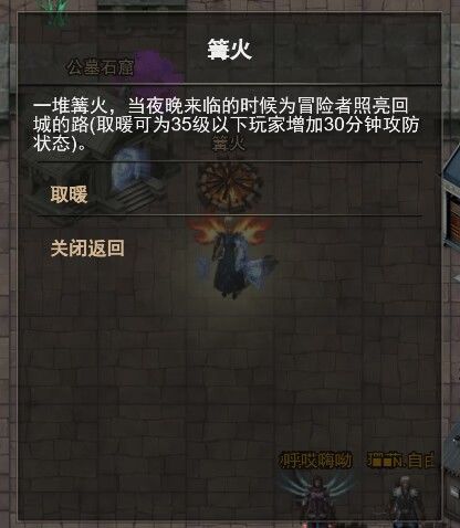 新手村最上面的篝火,提供50的攻防加成,持续30分钟,仅限35级及35级以下玩家。打世界boss或者下副本之前,点一点篝火,能提供很可观的战力。