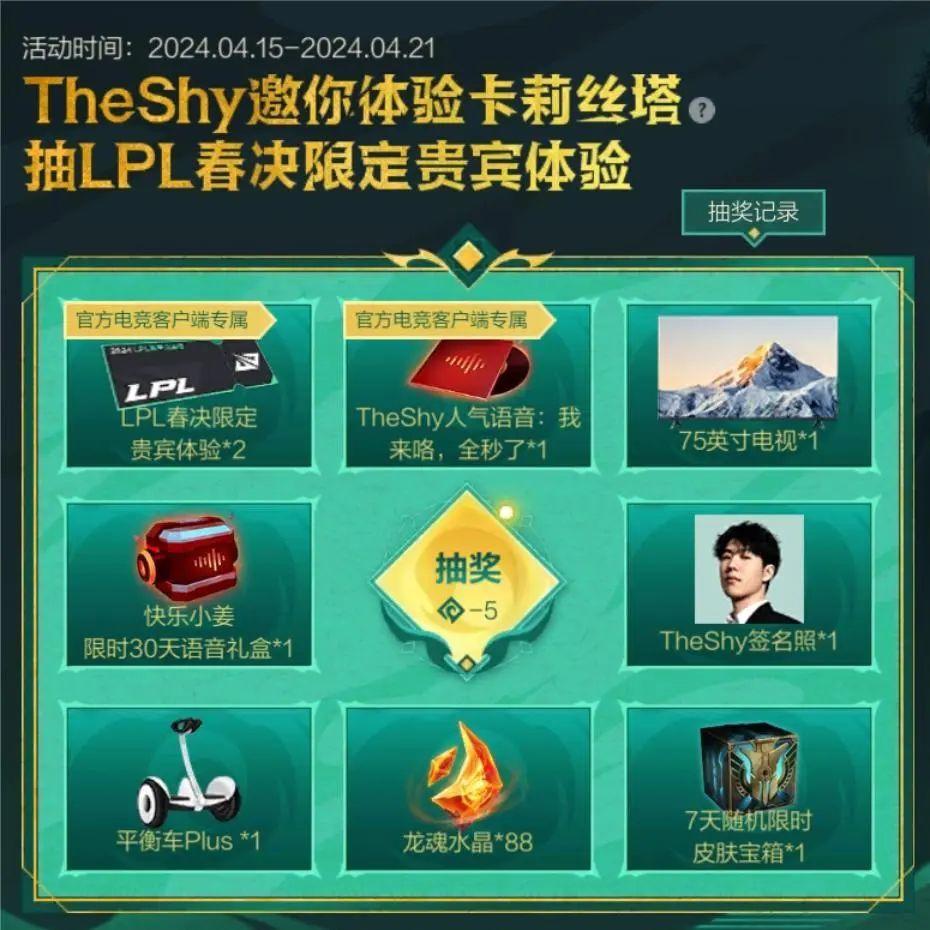 奖励:LPL春决限定贵宾体验,TheShy签名照,平衡车Plus,龙魂水晶*88等