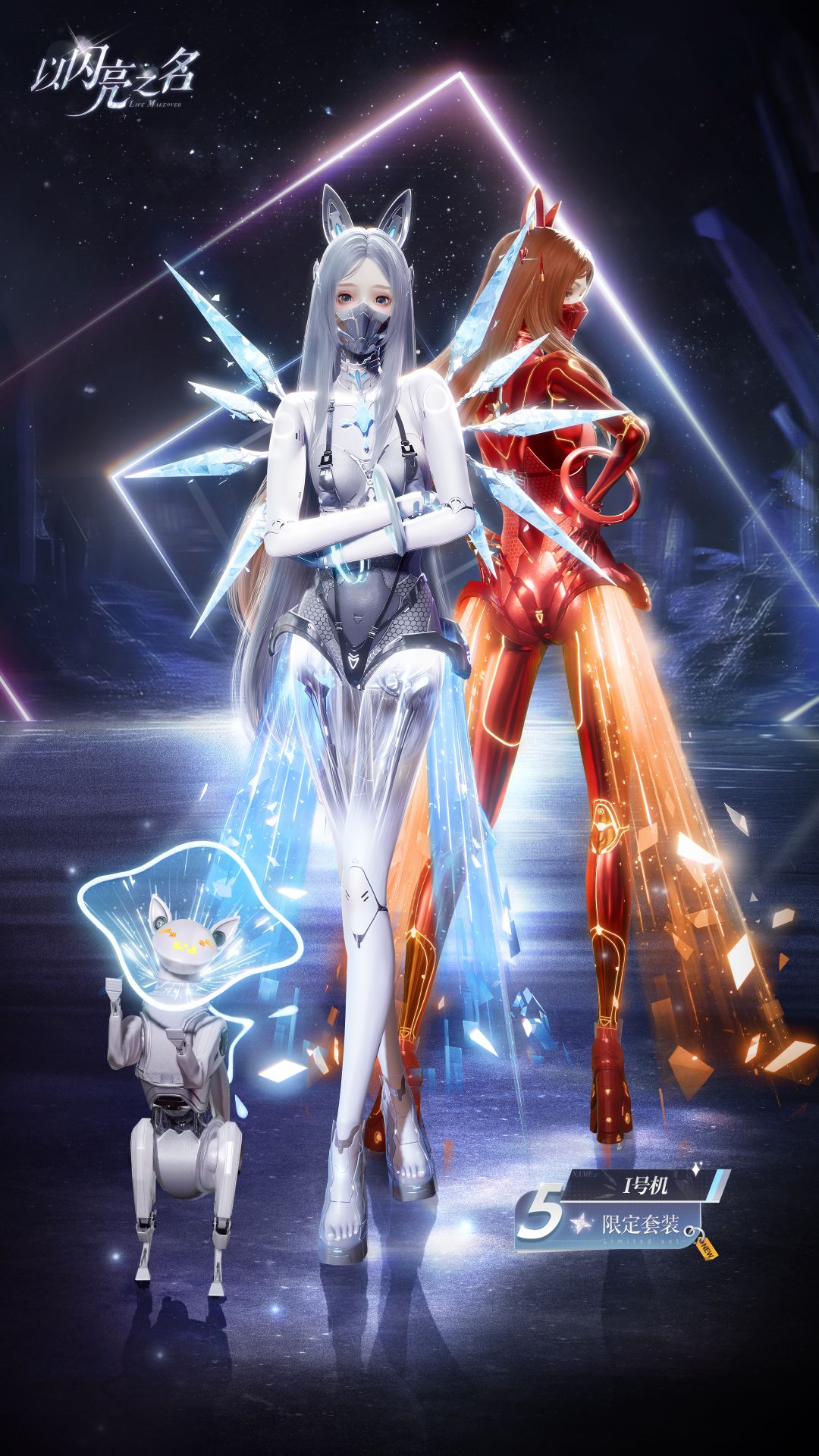 【技术呈现】腿部的纹身增加闪动的效果,机械猫耳的设计上添加led灯,与机械宠物相互呼应,体现未来机械与仿生感。为了完美展示仿生人的身体曲线,采用了紧身式的裁剪,大量漏出的皮肤部分,让未来科技感更加沉浸;仿生人手镯添加特效光环,减少单一重复的视觉效果,翅膀展开时会有动态示意且配合科技感激光冰花状特效,强化了套装的机械感和科技感;