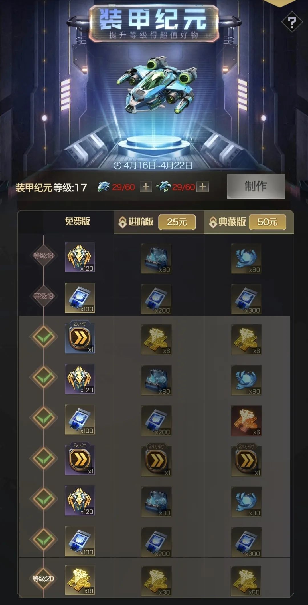 活动期间可通过击杀野怪、采集和联盟捐献获得装甲纪元的材料,消耗相应数量的材料可提升装甲纪元的等级,等级提升后可获得对应等级的奖励,奖励分为免费奖励、进阶奖励和典藏奖励,进阶奖励和典藏奖励更为丰厚。