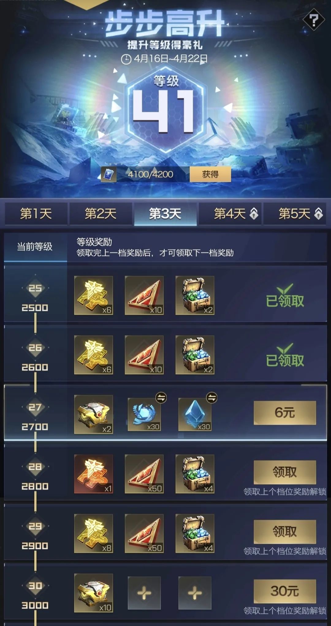 步步高升活动期间会逐天开放各类任务,完成任务即可领取丰厚奖励,任务奖励中含有试炼币,收集试炼币可使活动等级步步高升,最高可提升至60级,活动等级达到指定要求,即可解锁试炼礼包。