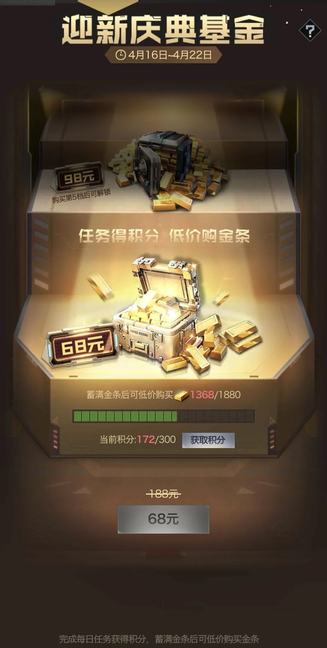 庆典基金的金条非常划算,直接冲!配合着做点券夺宝和玫瑰之约即可,需要注意的是当前庆典分满后不会继续累积,解锁当前阶段后下一阶段积分需要重新累积。