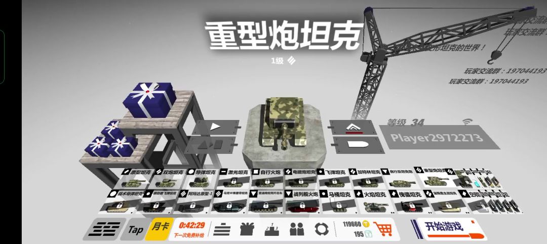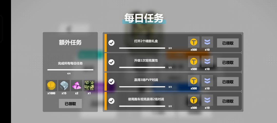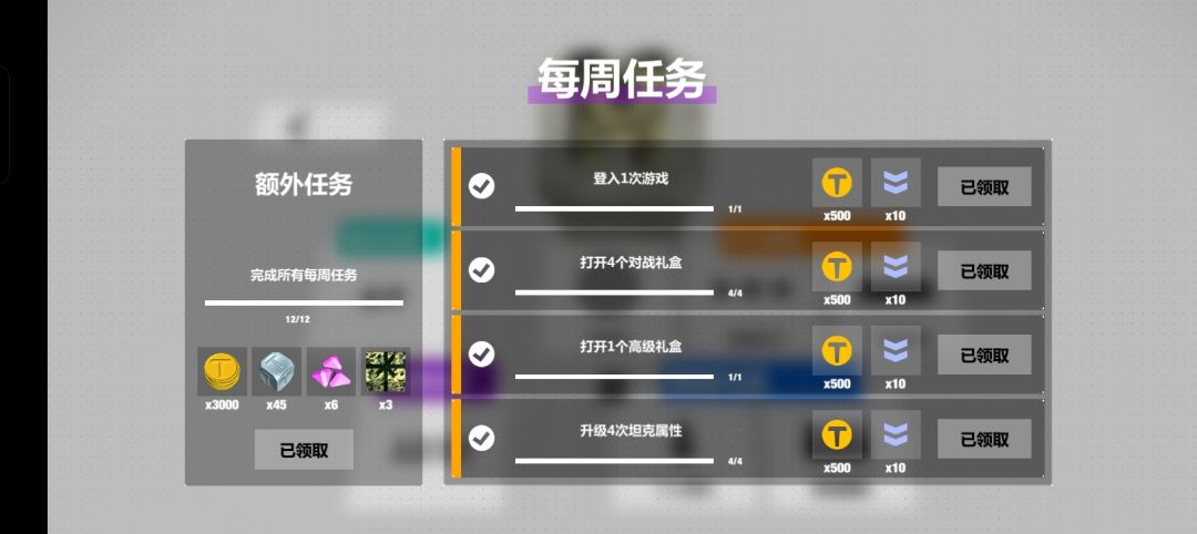 三:游戏一开始先不要升级坦克,这样会被安排去一级房而不是萌新房,一开始先按照指引完成原型坦克和双跑坦克的关卡解锁每日任务和每周任务。这个时候,如果距离星期天有四天,并且每日都有上线的话,就可以每天完成每日任务,领取到对战礼盒(无法购买)和钻石。(礼盒购买及开启要先点击下方购物车,再点击右上角的礼盒按钮)