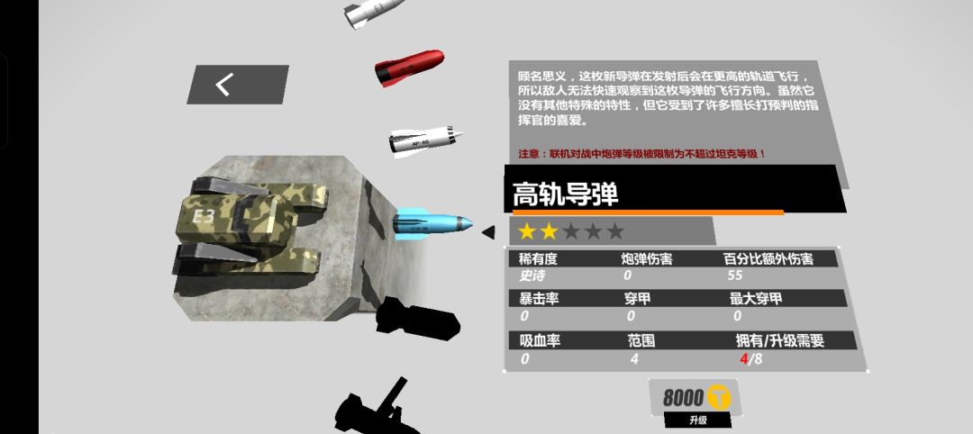 导弹发射后在空中呈直线运动,具有速度快,伤害高,打击精确等特点(导弹不受力场影响)。玩此坦克需要极强的预判能力以及技术水平,如果感觉自己预判能力非常强的话,这个坦克也是不错的选择。
