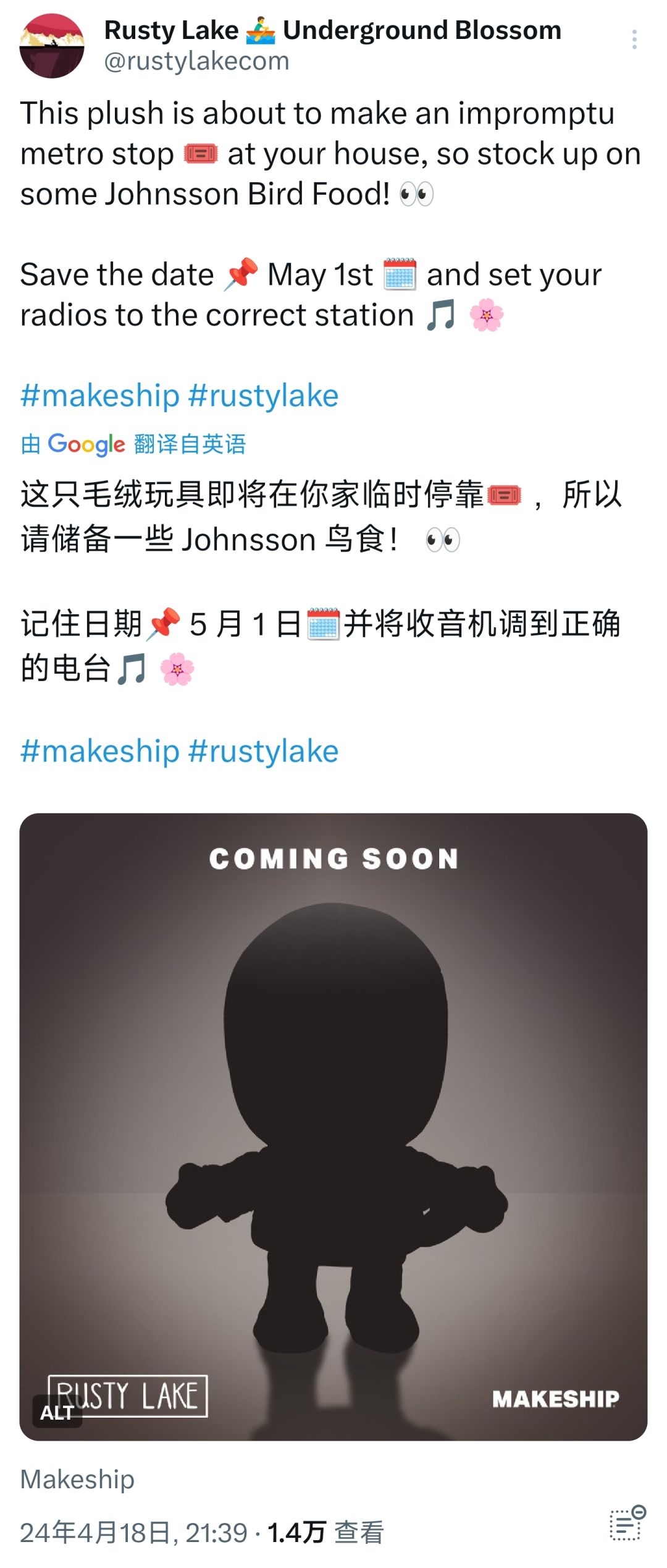 另外,前几天锈湖还公布了一个与玩偶生产商MAKESHIP联名的剪影,「这只毛茸茸即将在你家停靠」。要出毛绒周边的会是哪只鸟呢