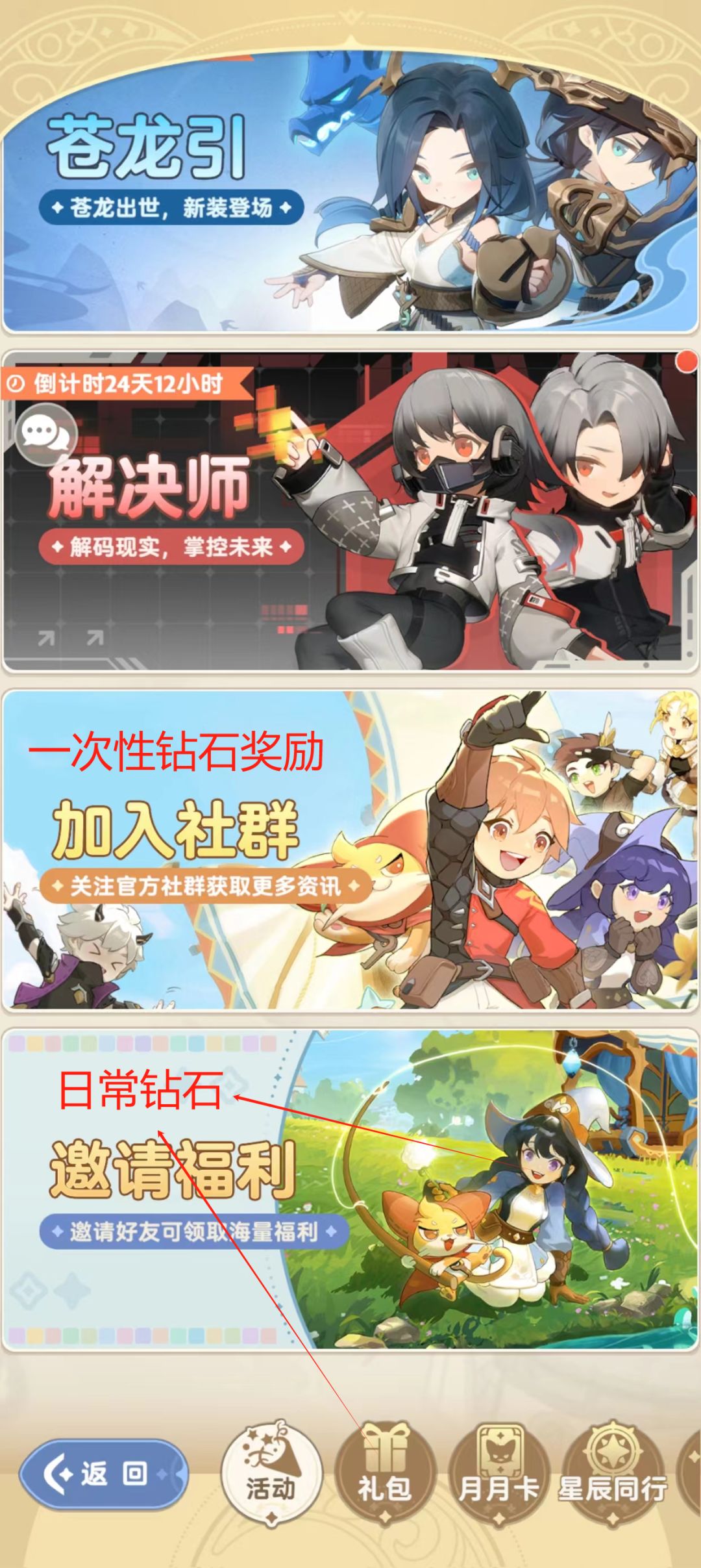 1.免费资源不要漏领。日常资源包括开服特惠右上角钻石、邀请福利每日分享、礼包每日钻石、时装扭蛋每日签到、登录好礼、月签到,一次性资源比如关注给钻石,只用点链接,不需要真的关注。