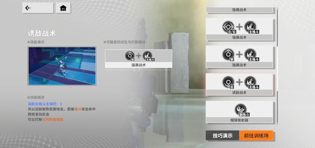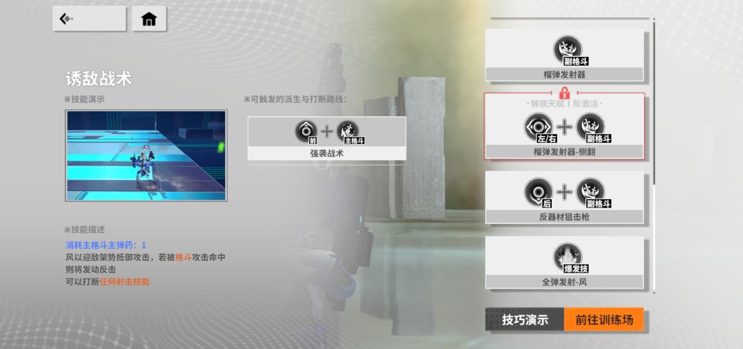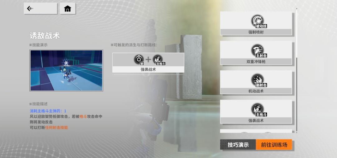后格:格反,也就是发动后会进入一个架势,期间被对方格斗命中的时候会立即反制对方格斗,并给对面一巴掌,在被对面格斗机硬上的时候进行最后一博的,可以打断所有的射击技能,所以千万别着急摁,因为要注意因为这玩意会消耗弹药,所以不能连续使用