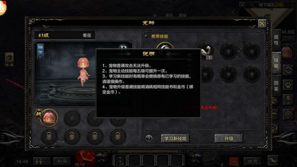 2. 提示: - 宠物普通攻击无法升级 - 宠物主动技能再宠物达到25级以后每提升5级可升级一次 - 学习新技能时有概率会替换原有已学习的技能,记得优先学满被动技能再升级被动技能等级