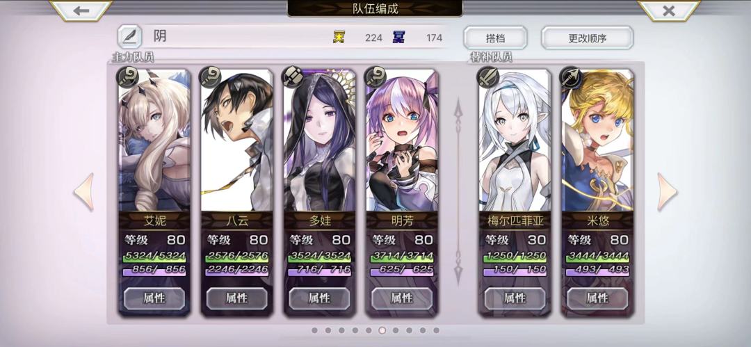 阴队标准配置:艾尼+八云+ES多娃,第四人 可以选择 的很多:我用的AC茶壶,可以用AS伊法、猫可可等辅助角,也可以 用一些副C角色,但是我没试过效果,替补是上有加成的角色(宝石加成和伤害加成各上一个),搭档带八云的宝宝“库莫斯”