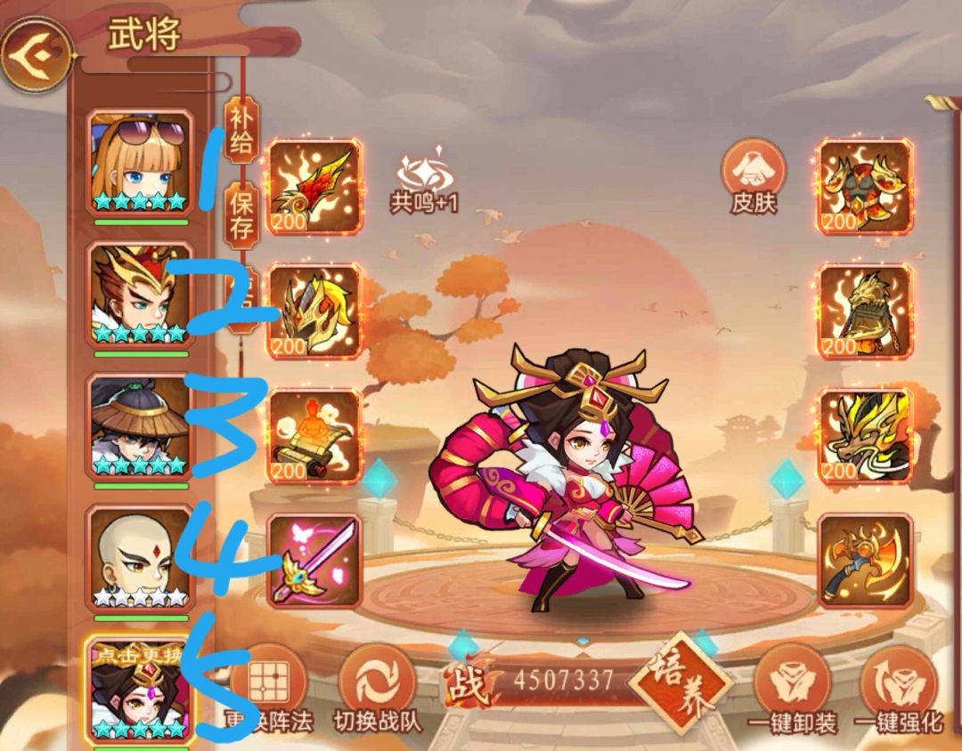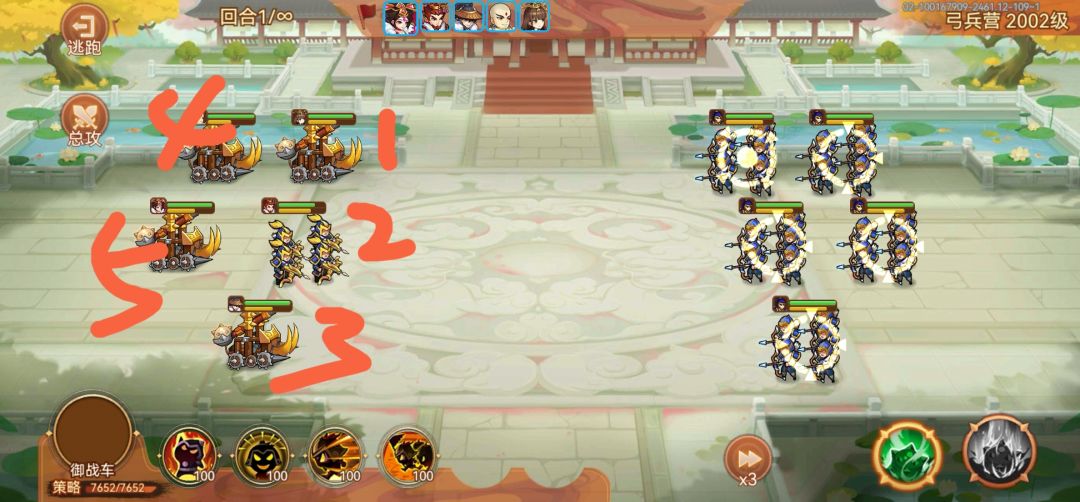 2.战斗位置:兵种的战斗位置和我方武将界面的位置是固定的,我方武将界面从上到下1-5,分别对应兵种战斗位置,我方前排从上到下123号位,后排从上到下45号位。