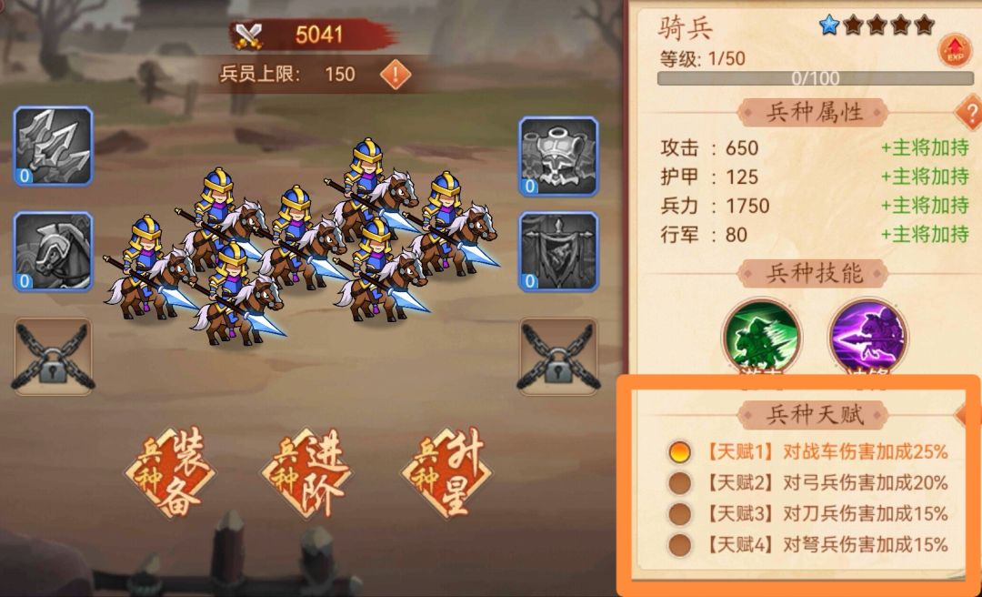 4.兵种天赋:即为兵种之间的相互克制关系,拥有天赋就能对对应的兵种造成伤害增加,例如骑兵天赋1对战车伤害增加25%,那么当兵种战时我方使用骑兵军团攻击对面战车军团时就可以伤害增加25%。