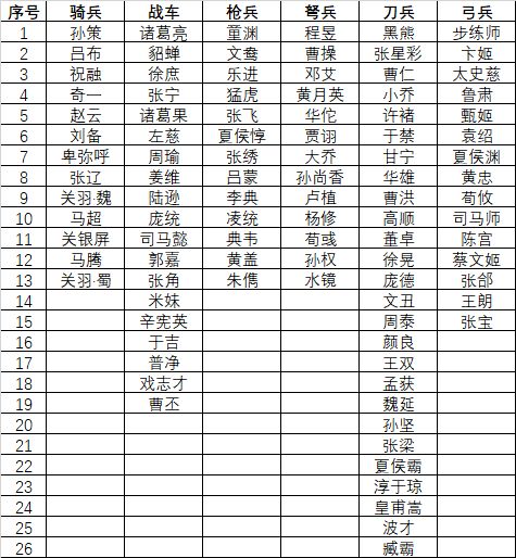 这里也直接附上目前各兵种所对应的武将列表供参考查阅(感谢二群管理周总整理的表格)。