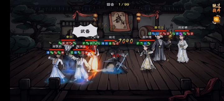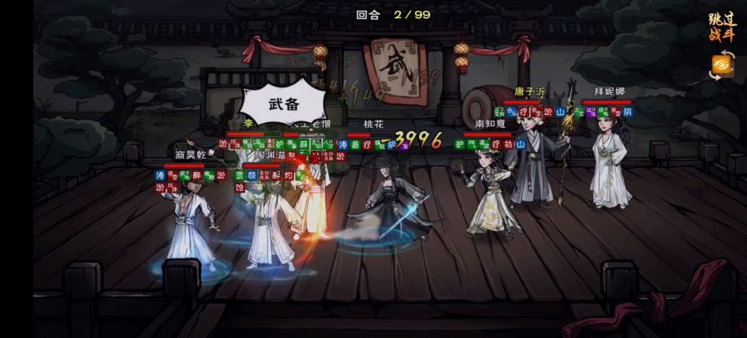 2.醉拳克制一部分武学。目前发现,醉拳对于狼枪、十一剑有着一定的克制作用,尤其是狼枪。由于狼枪本身阵容关系,醉拳基本上是能在中路对位上狼枪的,因此大约在第二回合期间,狼枪会被挂上醉3甚至漫无章法的buff,而且最重要的是,狼枪的武备不会消耗漫无章法buff,这时狼枪的武备伤害会大幅度削弱。(如图所示,伤害从7000+降到了4000不到)十一剑的话纯粹是寒汐无法阻止十一剑切后,而醉拳多少可以挂上一点buff来限制十一剑。