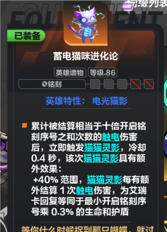 1孔遗物有触电状态就能自触发,12二孔叠满电光就能自触发,123孔有两个以上目标就能自触发,不然就会和自身猫影同步,345孔需要配惰性闪电实验,但是有时候会断不能像123孔一样站着不动无限触发,而且猫2自触电决定了需要靠高护盾和遗物回血达成回复平衡,不然就要浪费追忆格子去找额外闪电减伤