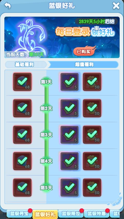 活动期间,所有玩家每日登陆均可领取一份好礼,购买蓝银好礼认证后,更能解锁高级奖励,每天登陆就能变强!