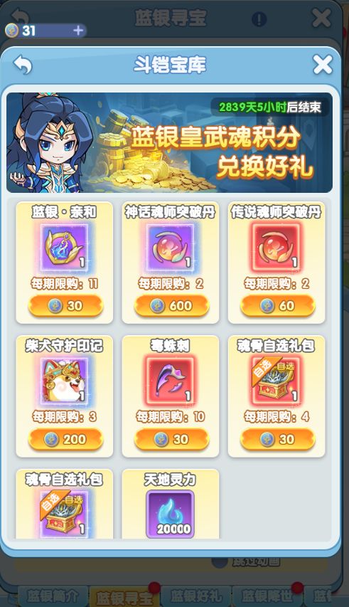 各种珍贵宝物仅在活动期间出售,错过不再有。玩家每日可前来免费领取福利,更可购买超值特惠礼包,加速修炼蓝银武魂。