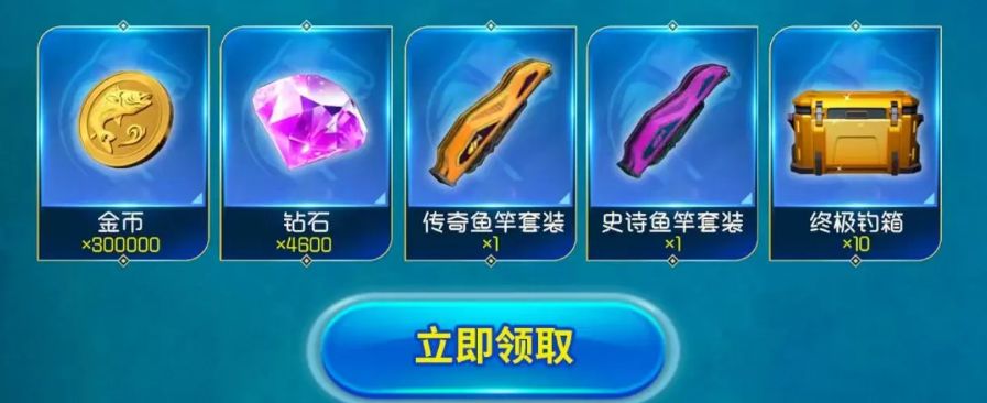 内容:终极钓箱*2,金币*388K,钻石*500,超巨型鱼T3卡*20