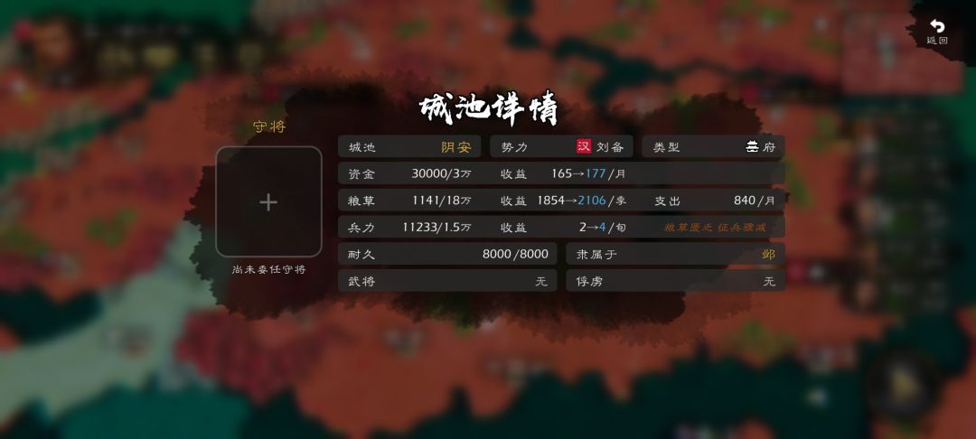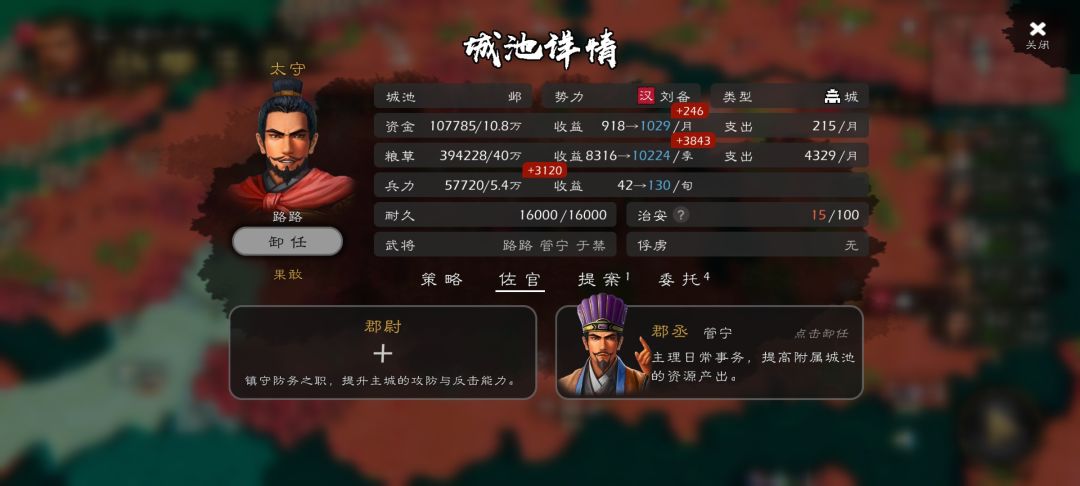 郡尉:提升城的防御和反击伤害(武统高则高) (不被攻打的情况下不用设)