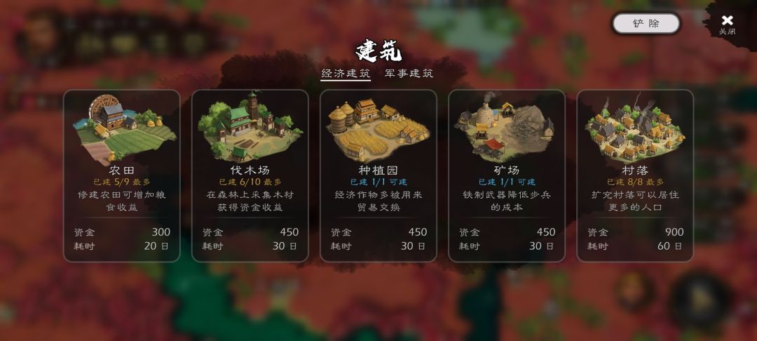 经济建筑四种:农田-粮食,伐木场-资金,村落-人口,特产(蓝色)