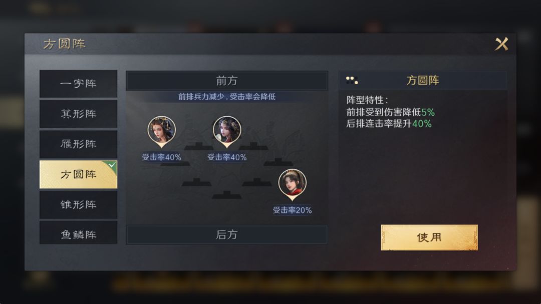 阵型特性:前排受到伤害降低5%,后排连击率提升40%。