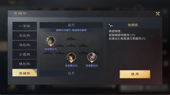 适合前排武将需要提升规避率的队伍,针对性较强,某些特定武将非常适合鱼鳞阵。
