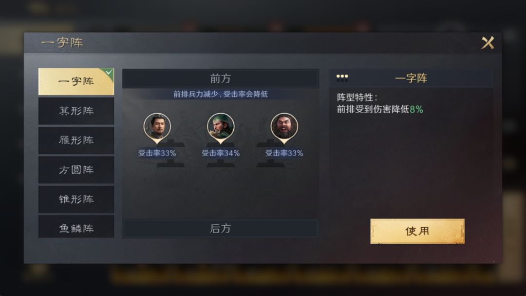 适合大部分阵容,拥有所有阵型最高的减伤效果。三名武将受击率相同,同属于前排。