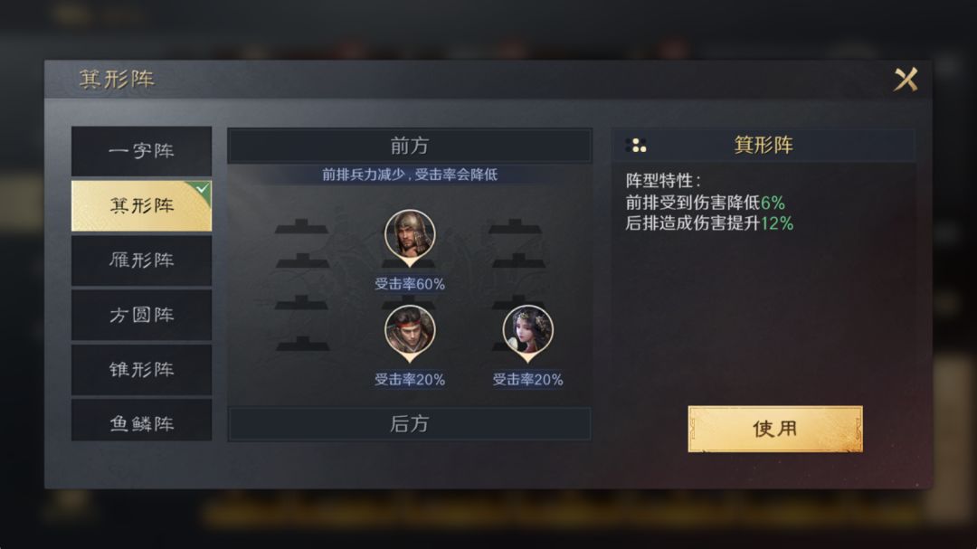 阵型特性:前排受到伤害降低6%,后排造成伤害提升12%。