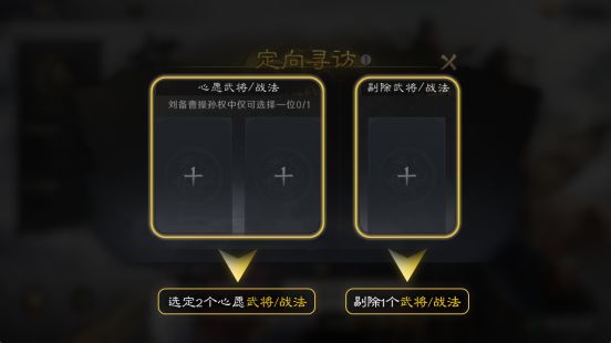 进行定向寻访前需要先选定2个心愿武将/战法,并剔除1个武将/战法,被选定的心愿武将/战法被寻访到的概率提升。