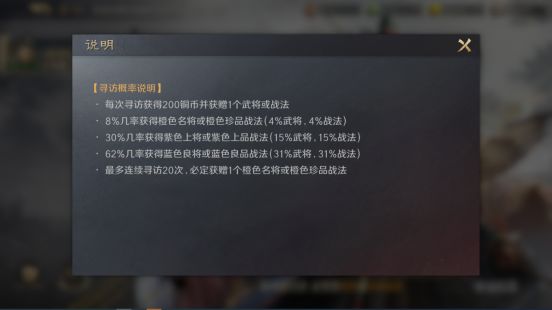 5.最多连续寻访20次,必定获赠1个橙色名将或橙色珍品战法。