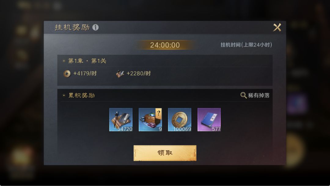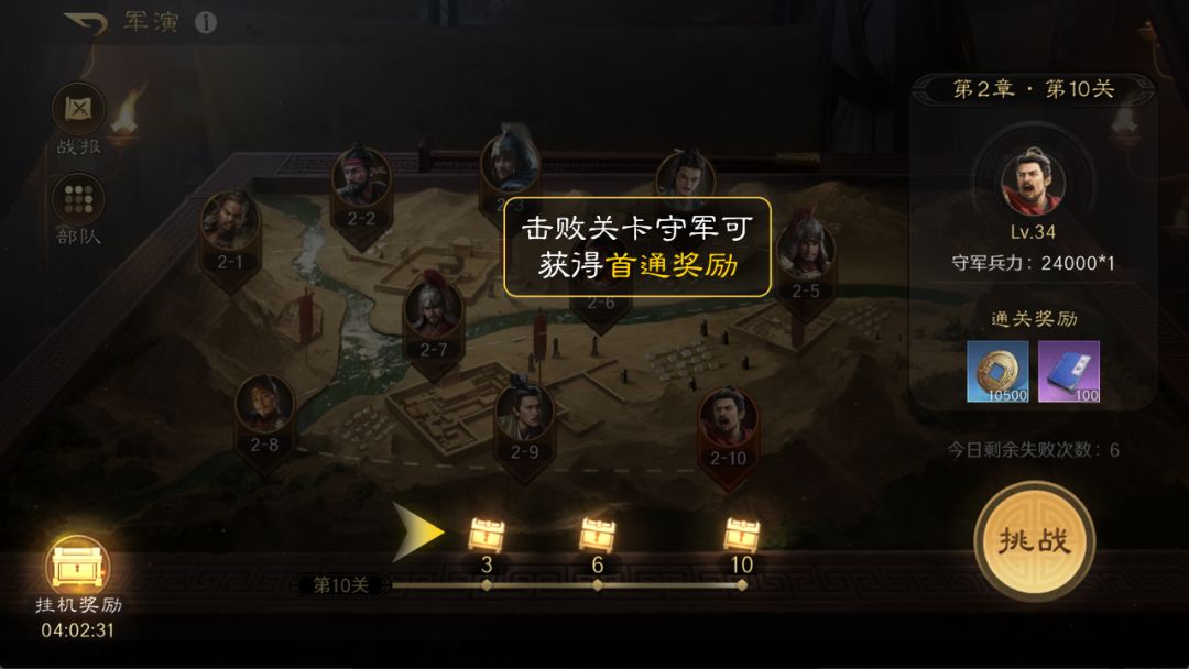 军演玩法是让玩家配置的部队去挑战不同的守军,通关每个关卡都能获得首通奖励,每通关一定数目关卡可以获得宝箱奖励。挂机奖励包含储备经验、打造材料箱、铜币和天赋经验。挂机奖励最多积累24小时。