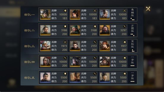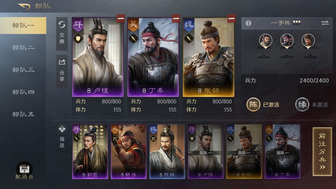 在编队界面,即可看到自己的部队和上阵武将信息,包括兵力、体力、阵型等信息。部队的阵容加成和缘分加成也会展示在界面中。