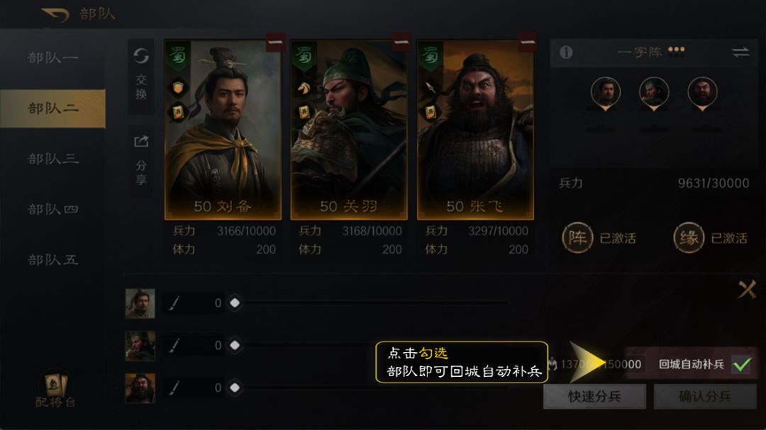 各位玩家可以通过编队系统对部队中的武将进行快速分兵,点击快速分兵即可直接补满兵力。如果预备兵不足则会把剩余兵力平均分开上阵武将,让三名武将的兵力尽量相近。