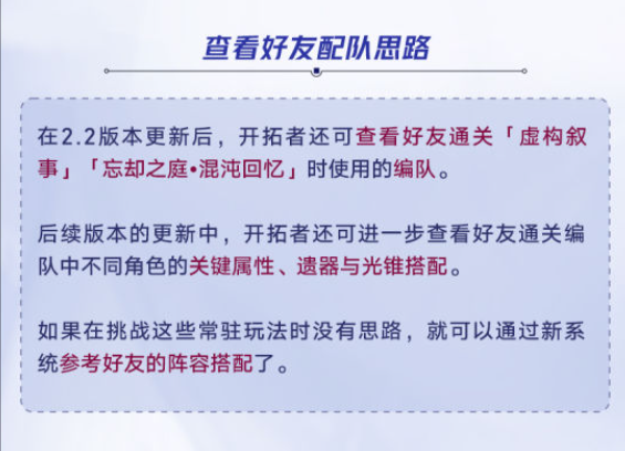 估计2.3之后就可以查看:好友通关编队中不同角色的关键属性、遗器与光锥