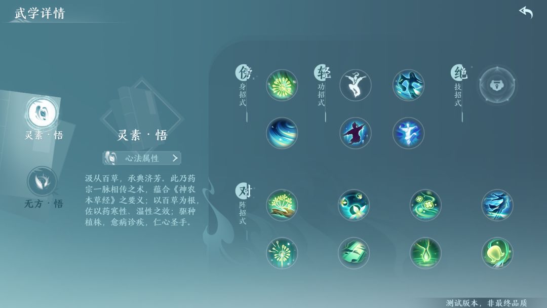 北天药宗传承于神农氏,武学套路也围绕药理展开。攻击时提取药材毒素对敌人进行持续压制,或使用暗藏的柳叶刀近身作战,身法轻盈飘逸。更可催动草木种子在场地或角色身上附着生长,以辅助自身。治疗时则用内力催动药草,巧妙利用药性搭配,为友方目标提供持续治疗。