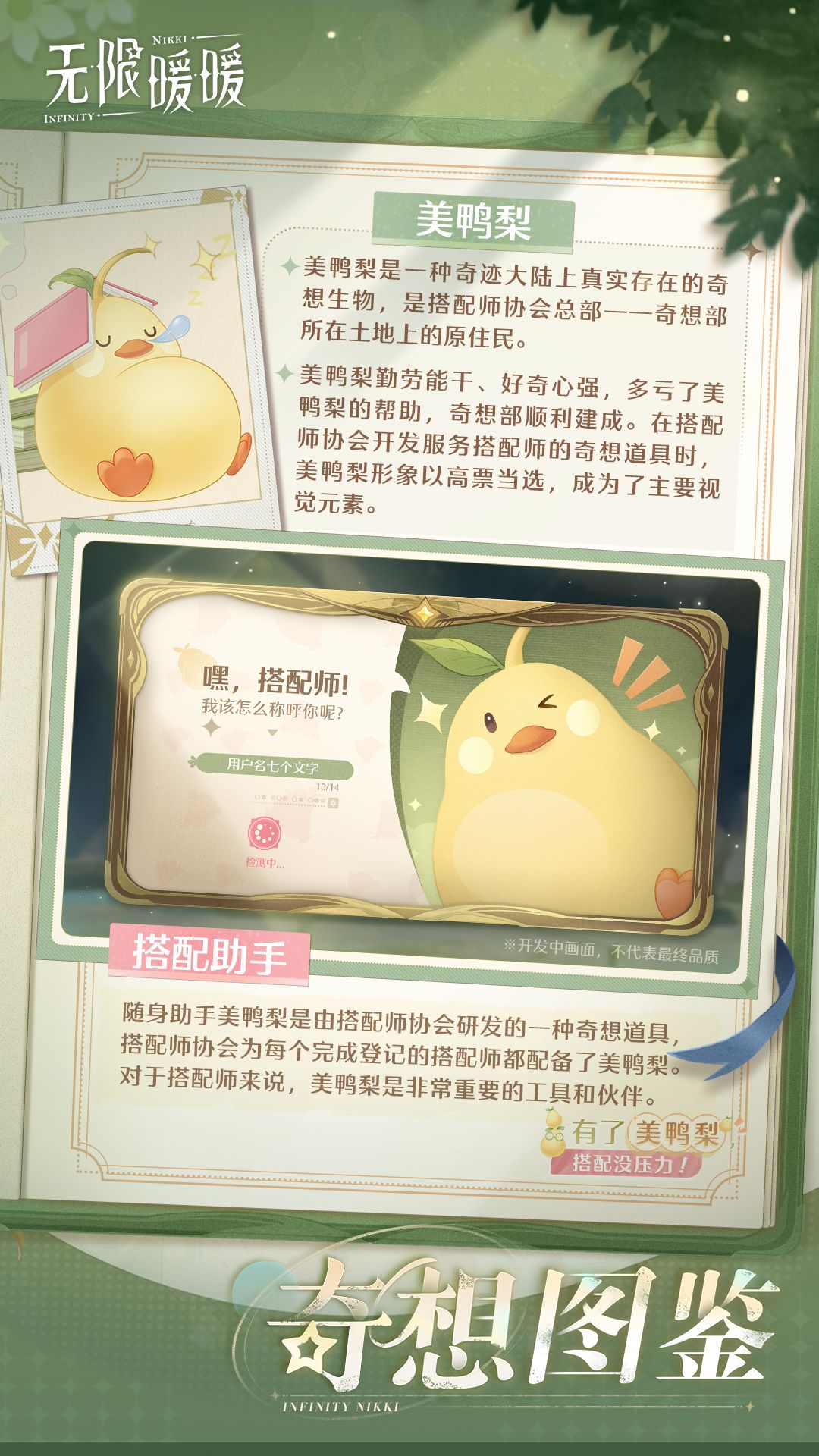 美鸭梨其实是生活在搭配师协会总部——奇想部所在土地上的原住民,与搭配师协会有着亲密友好的关系,因此被选作奇想道具随身助手的主要视觉元素。