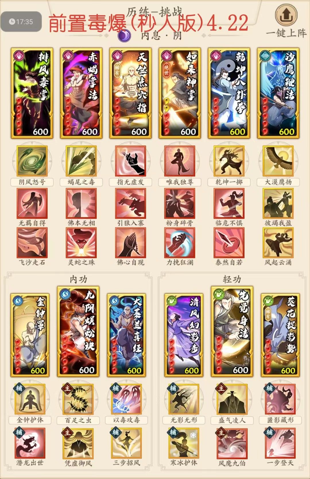 4.前置毒爆秒人版(谨慎使用,无毒手或者无先手能力 ,尽量不要用,整套配招基本只看排风赤蝎的触发情况,触发好了直接秒人,触发不好等着被对面杀就行,所以后四手配招没怎么倾注心血,随便搭的)