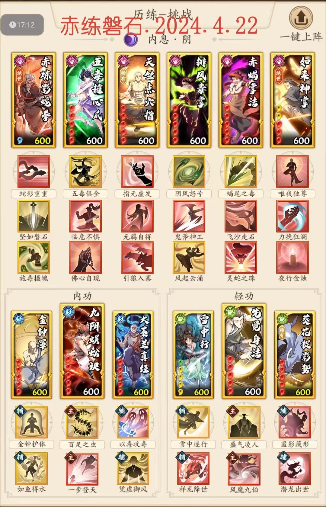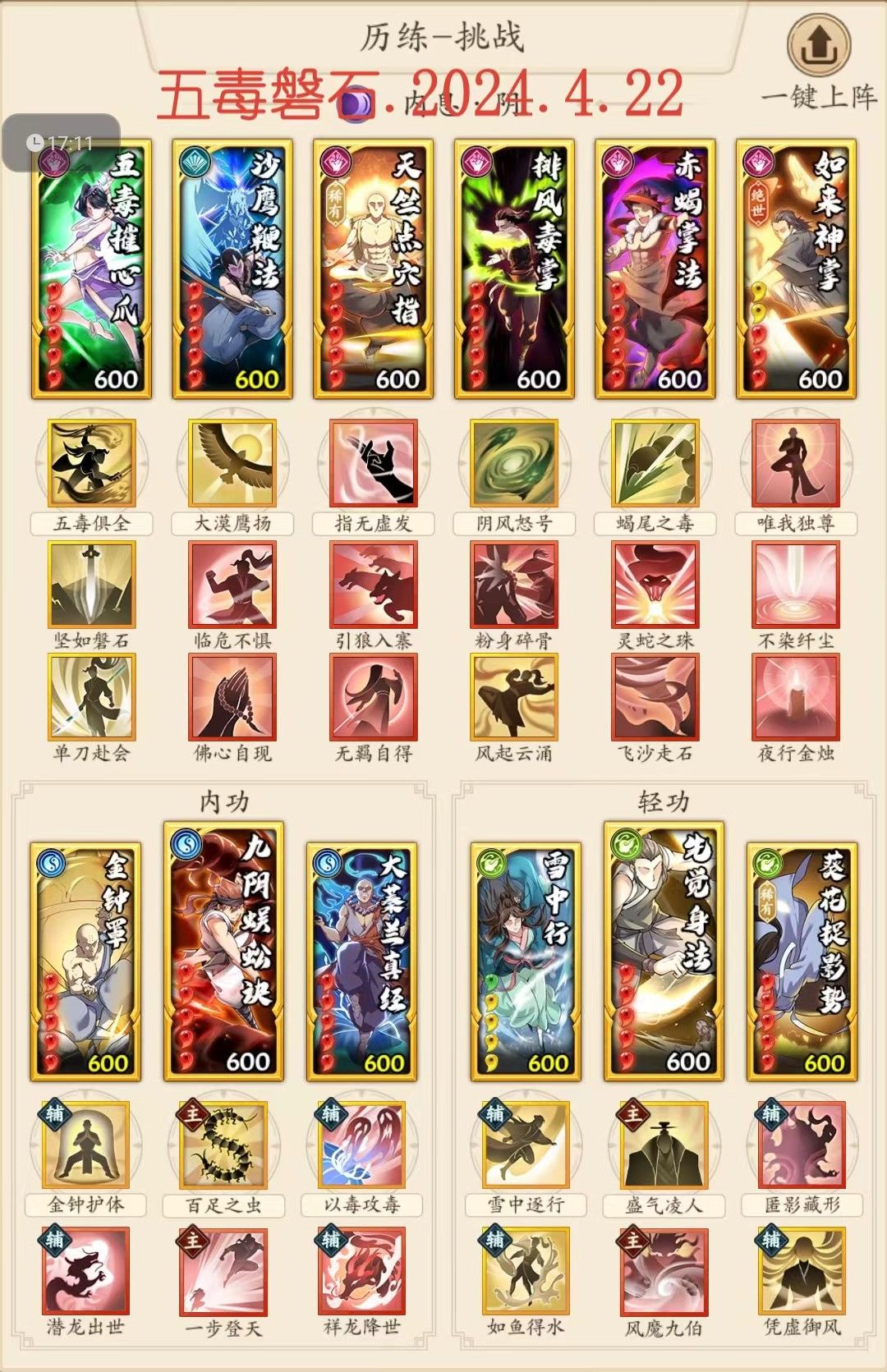 1.五毒磐石(适用所有范围,打吸内自行加调息可粉身碎骨换豁然或沙鹰/磐石加解甲休兵)