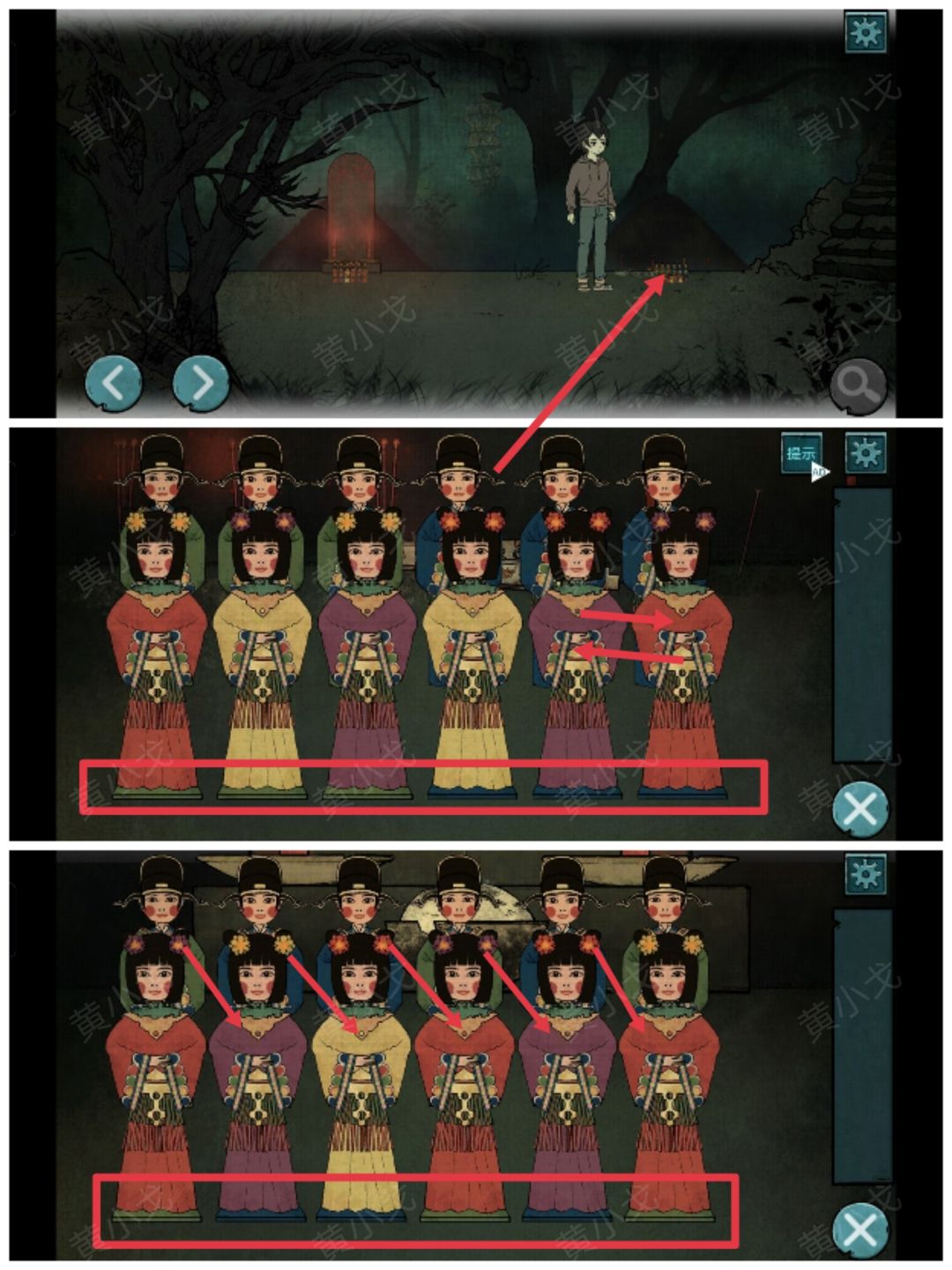 10.点击右边墓碑前的纸人,根据左边的纸人位置,调整右边的纸人(红衣头花黄、黄衣头花紫、紫衣头花黄、黄衣头花红、红衣头花紫、紫衣头花红),触发剧情(规律是裙摆的颜色对应男纸人的衣服颜色、左侧女纸人的头花是右侧女纸人衣服的颜色)