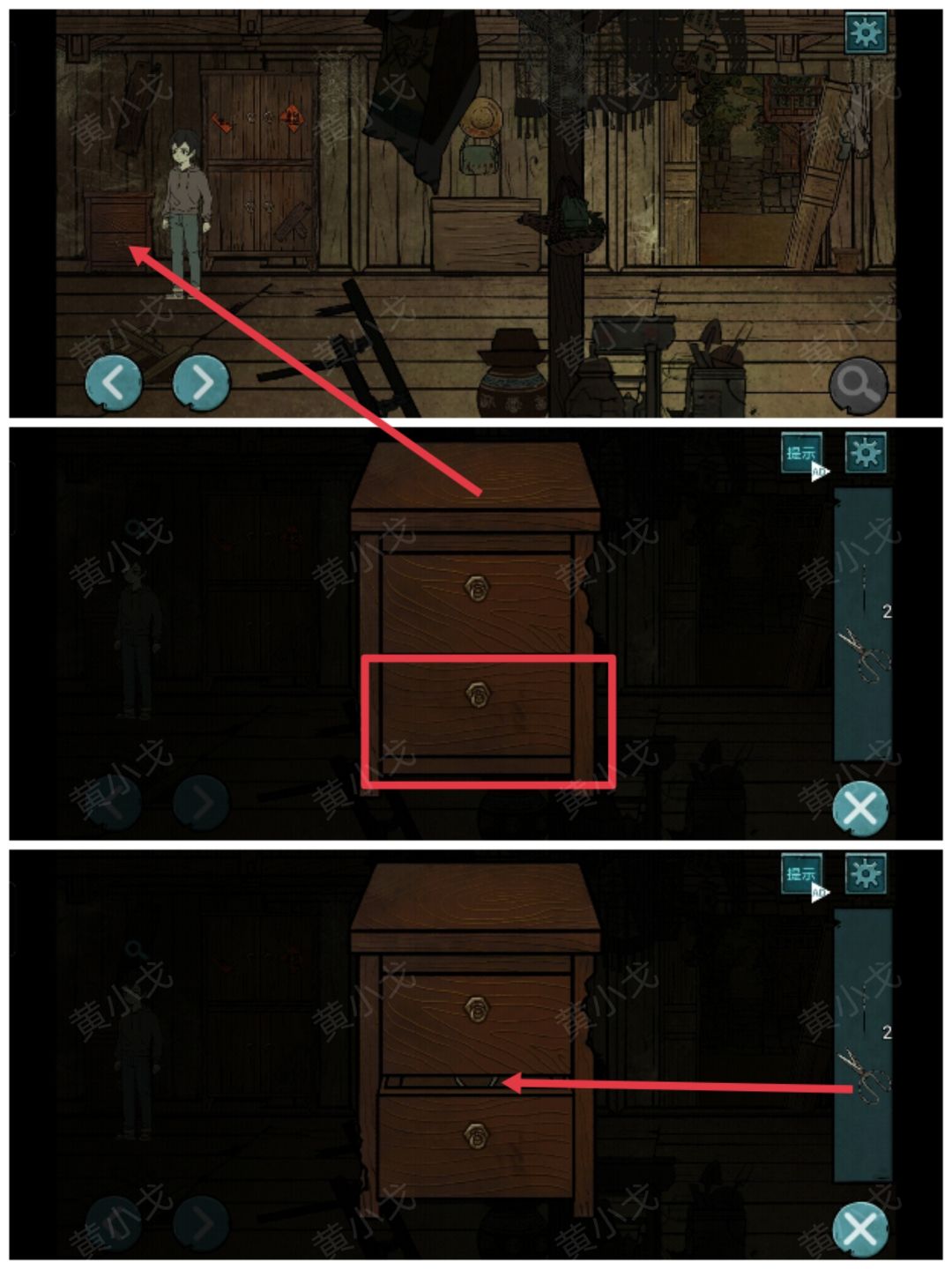 4.(一楼)点击最左边的柜子,拉开下层抽屉,用【剪刀】剪开绳子
