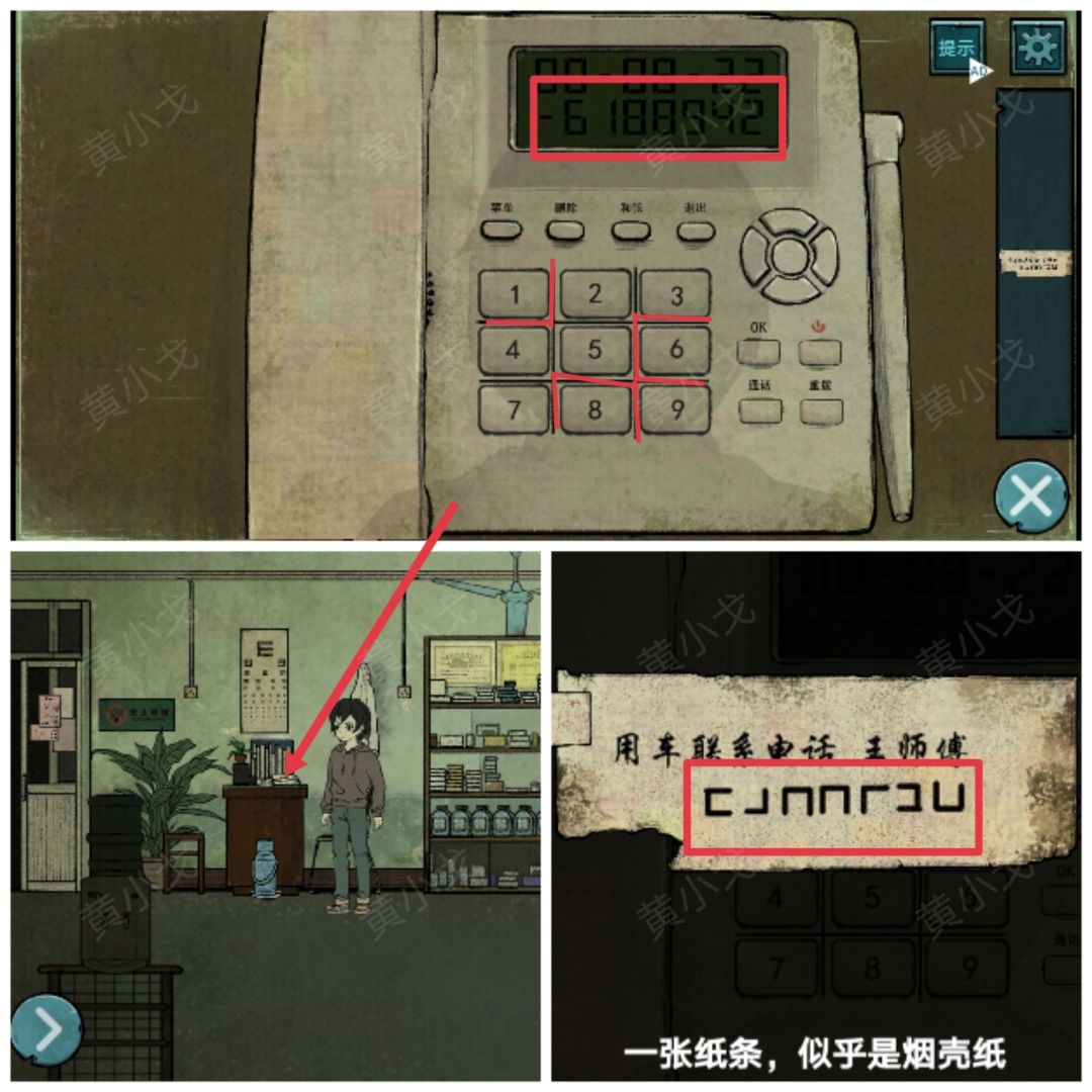 12.点击桌子上的电话,根据【纸条】上的线索及电话上的九宫格,推出号码:6188942,拨打电话,触发剧情