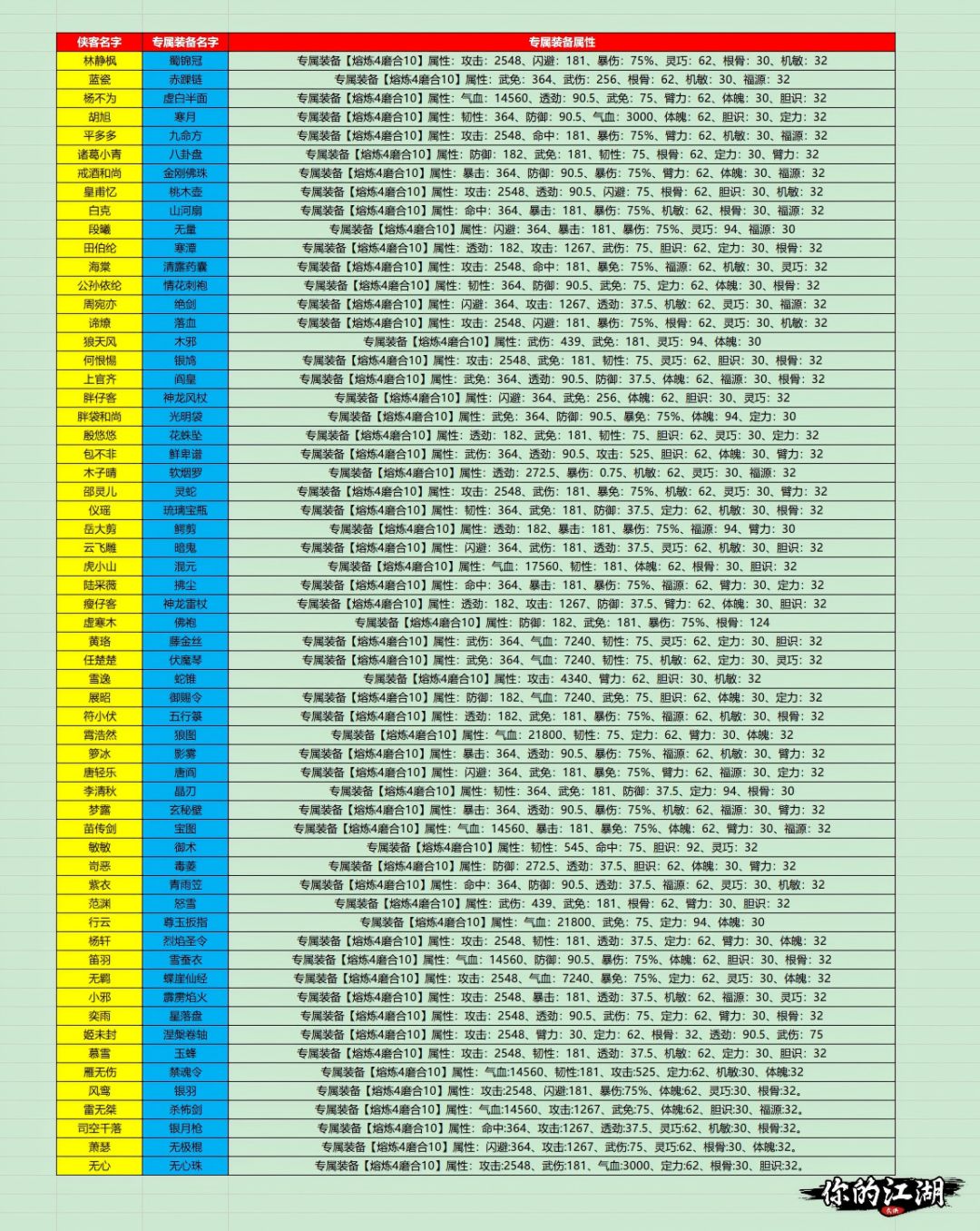 侠客对应专属及满锻熔炼属性(无心版)