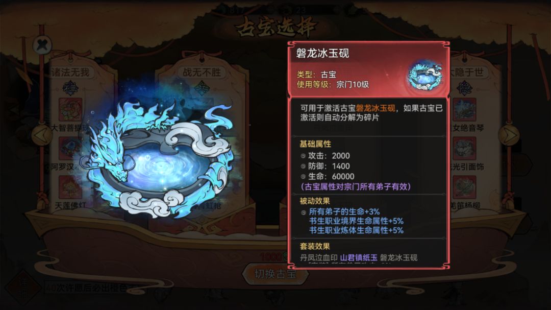 磐龙冰玉砚可以次要考虑,这个古宝比较侧重于生命属性,相较于防御属性,生命属性会来的更加实际一些。