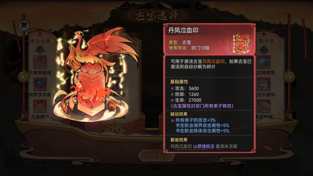 这次仙宝现世将带来与书生职业相关的3个古宝,分别是丹凤泣血印、磐龙冰玉砚、山君镇纸玉。3个古宝属性效果各有不同,丹凤泣血印更加侧重于攻击属性,可以优先考虑。