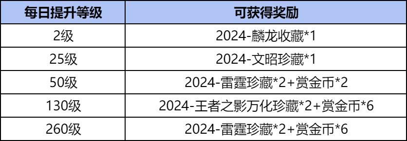 赏金币是游戏里的硬通货,也是联赛竞猜里不可或缺的道具,往往拥有更多的赏金币可以给我们带来更大的收益,此时,我们就可以采用这个方案,只需每日升级130级即可领取2024-王者之影万化珍藏宝箱*2+2024-麟龙收藏*1+2024-文昭珍藏*1+2024-雷霆珍藏*2+赏金币*8。