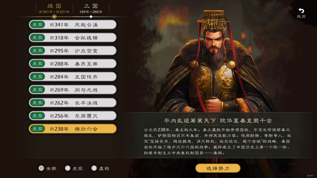 包含风起云涌、合纵连横、沙丘宫变、秦齐互帝、五国伐齐、阏与之战、长平决战、东周覆灭、横扫六合9个独立单元。