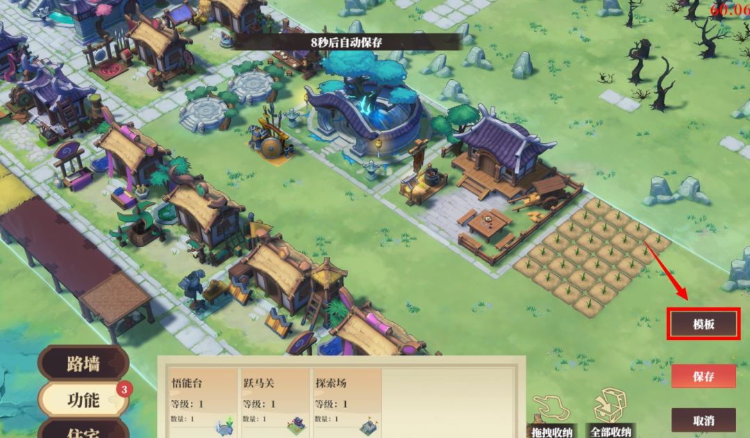 2·长按某个建筑,并点击【收纳】图标可进入【布景模式】。在【布景模式】内,点击【模板】按钮,可以将当前的布景保存为模板,方便下次快速布景。