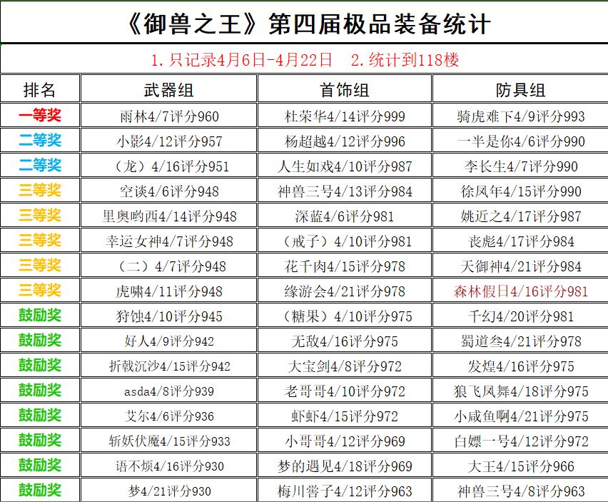 《御兽之王》第四届欧皇大赛获奖名单