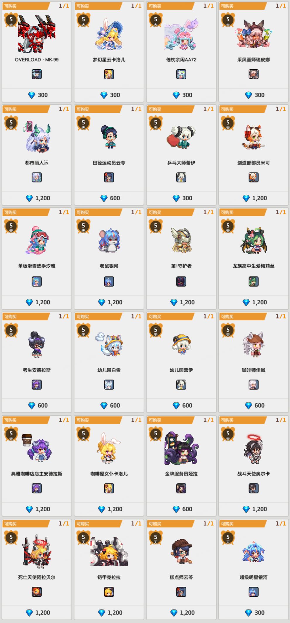 英雄时装:都市丽人沄,田径运动员云苓,OVERLOAD·MK.99,梦幻星云卡洛儿,倦枕余闲AA72,采风画师瑞皮娜