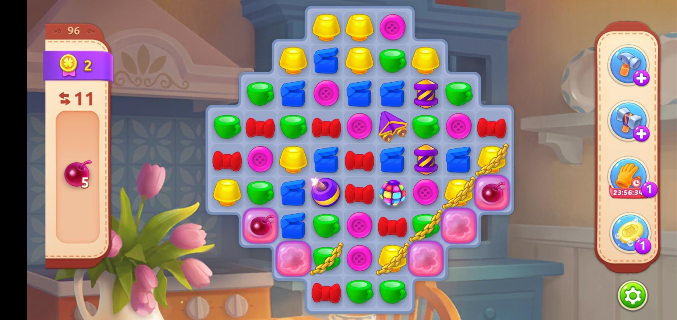 先用火箭把障碍物炸开,最后利用彩虹球和炸弹,基本完成关卡,本来想凑彩虹球和炸弹组合的,没能如愿