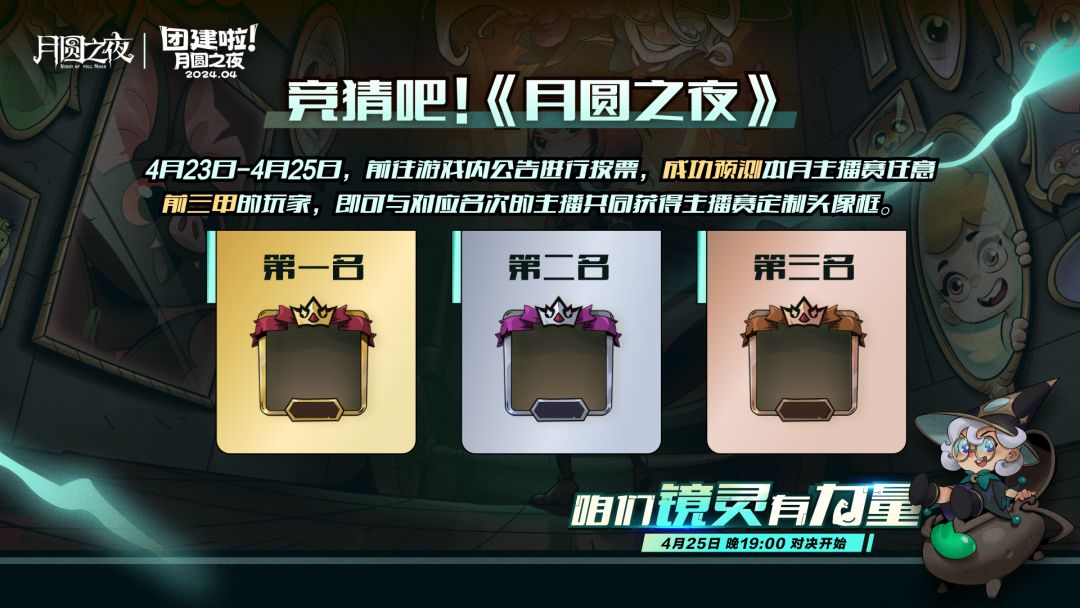 4月25日至5月1日,《月圆之夜》S3赛季主播团建首战即将开启!32位主播集结,携手「小小镜灵」对弈竞技,谁能在这场激烈角逐中拿下S3首冠?参与赛果预测,即有机会获得定制头像框!